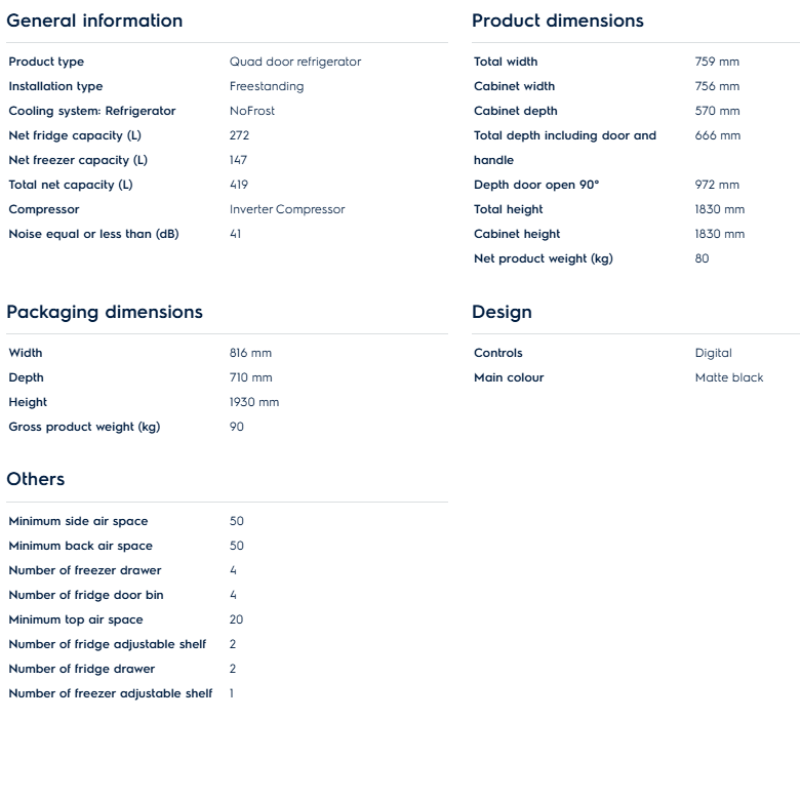 Electrolux EQE4200A-B 419L 4-Door Fridge, 600 Series, Quad Door Refrigerator Extra-Large Freezer, QuickChill EQE4200AB