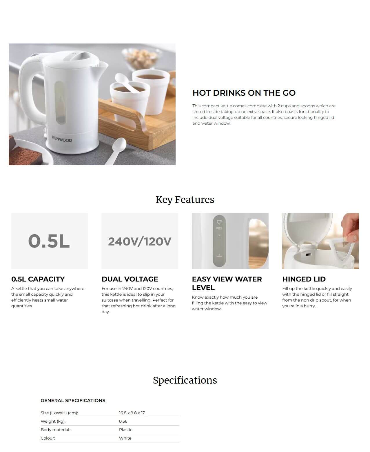 This compact kettle from Kenwood is designed specifically for travelling and small kitchen environments. If there is plug socket, you can heat water quickly and efficently, on the go.