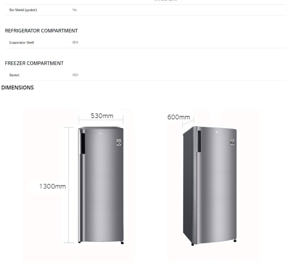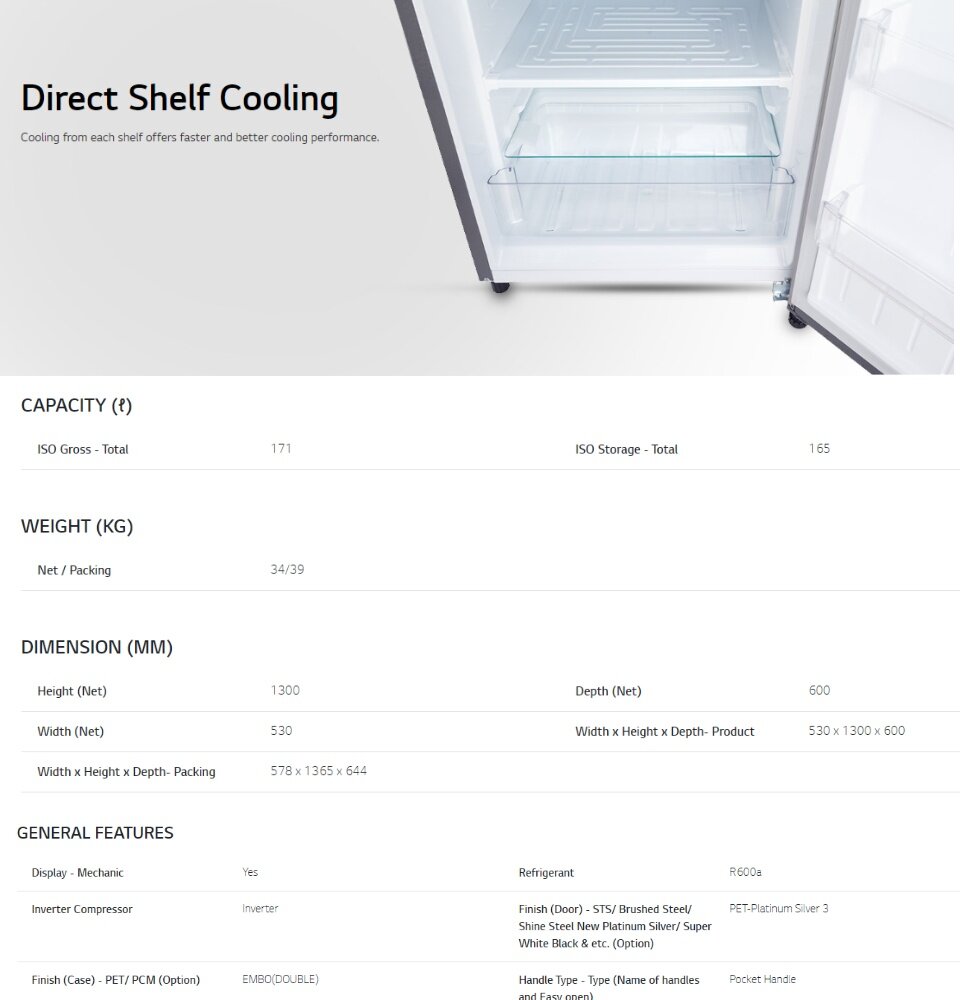Smart Inverter compressor ; Smart storage ; Direct shelf cooling ; Floor space saving; Dimension (mm) :57x136x144; Color Family:Grey Provide... Read more