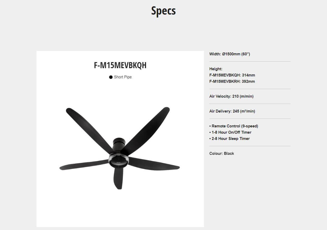 Width: Ø1500mm (60”) Height: F-M15MEVBKQH: 314mm Air Velocity: 210 (m/min) Air Delivery: 245 (m³/min) • Remote Control (9-speed) • 1-8... Read more