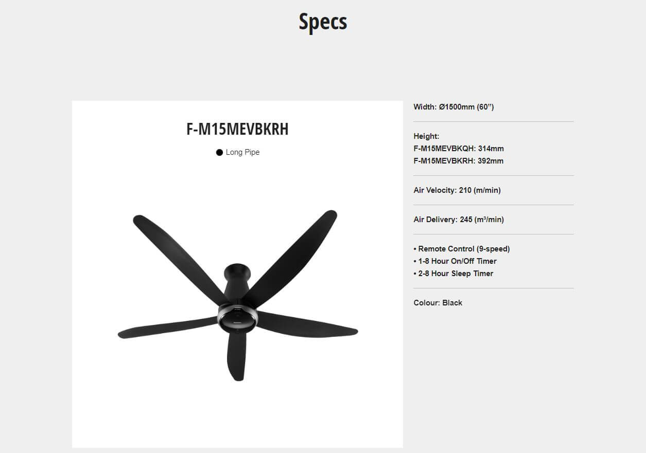Width: Ø1500mm (60”) Height:F-M15MEVBKRH: 392mm Air Velocity: 210 (m/min) Air Delivery: 245 (m³/min) • Remote Control (9-speed) • 1-8 Hour... Read more