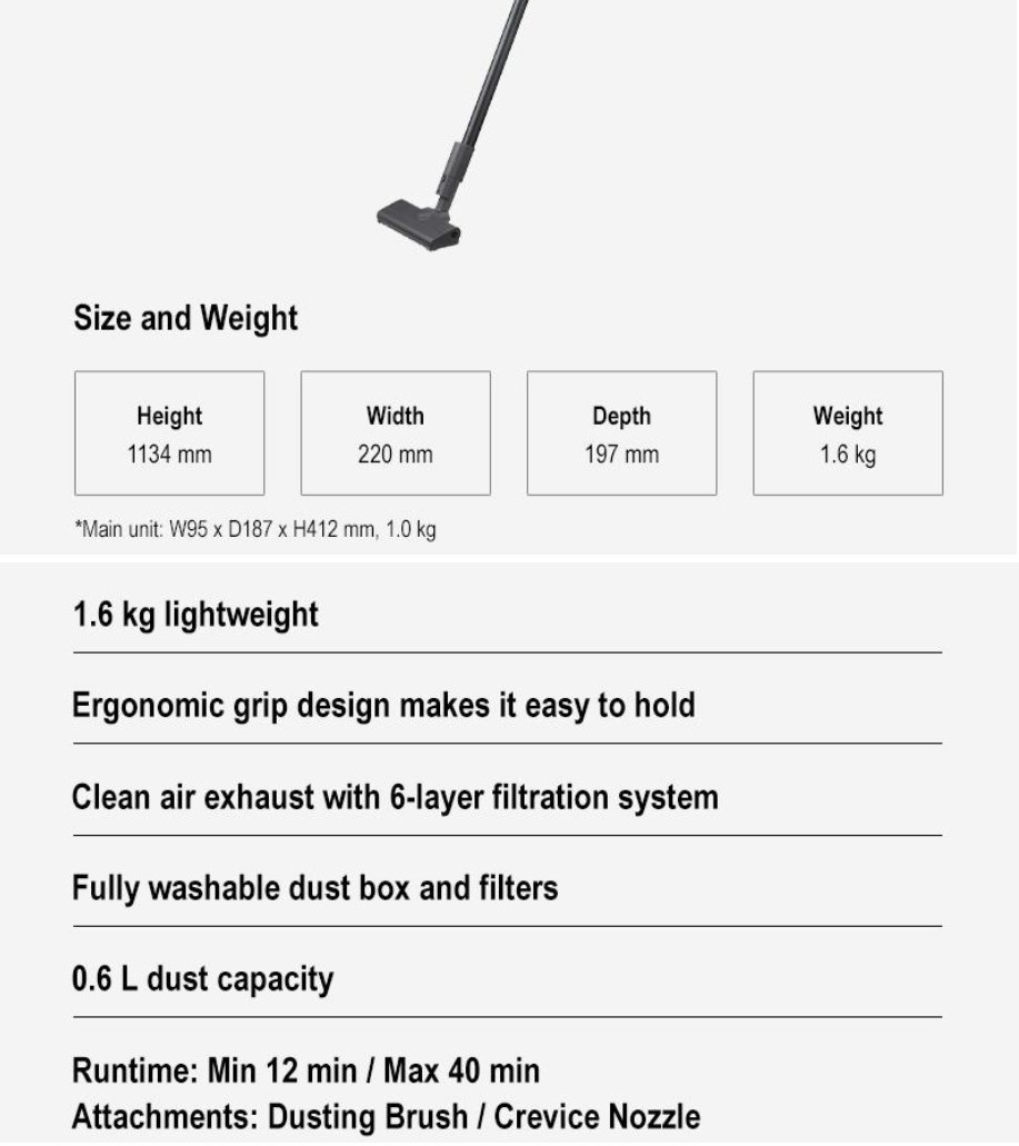 1.6 kg lightweight Ergonomic grip design makes it easy to hold Clean air exhaust with 6-layer filtration system Fully washable... Read more