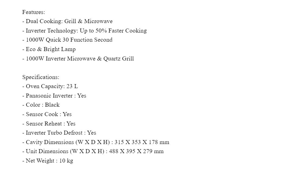 Panasonic NN-GD37HBMPQ Microwave Oven with Inverter Grill (23L) NN-GD37HBMPQ
