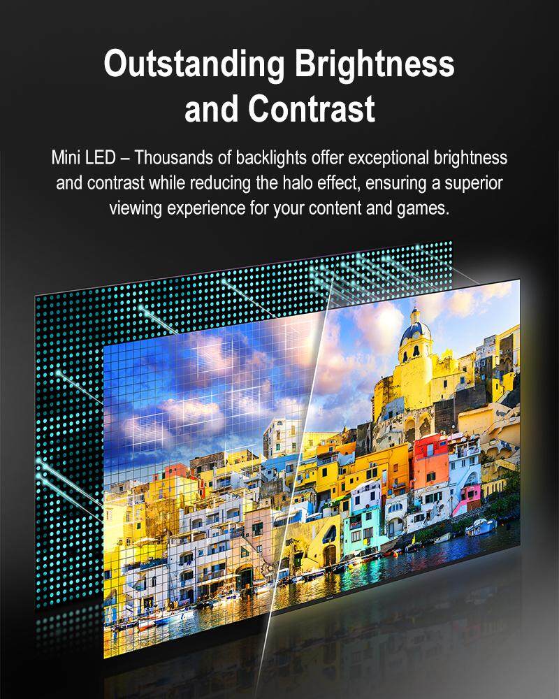 Thousands of LED backlights in our Mini LED TVs deliver outstanding brightness and contrast while minimizing the bleeding of bright objects into darker areas, allowing you to enjoy your favourite content and games without the halo effect common with conventional screens.