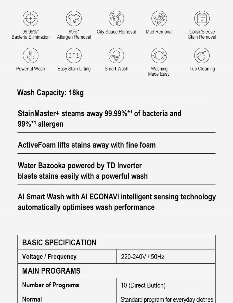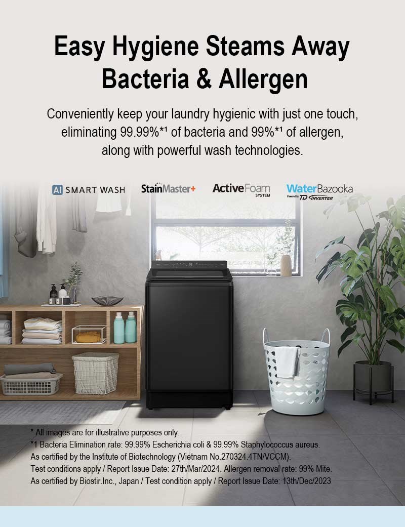 Worry-free Laundry, Hygienic & Clean Steams Away 99.99%*¹ of Bacteria and 99%*¹ of Allergen Lifts Stains Away with Fine Foam... Read more