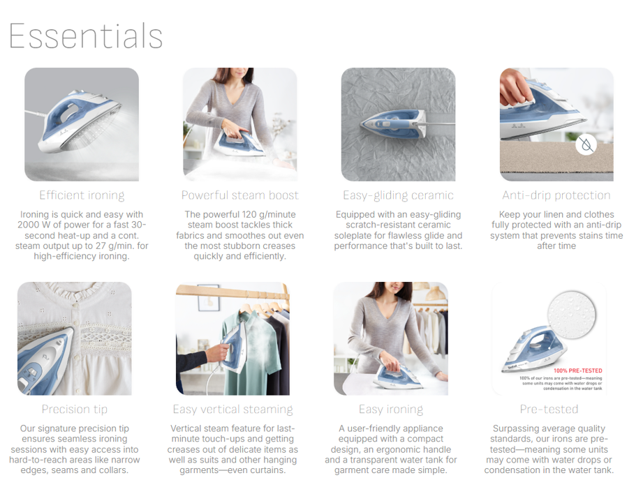 Model: FV2C41Product Features:• CERAMIC Soleplate- Easy gliding for faster ironing• Refreshes & Sanitizes - Kills 99.99% of germs, viruses &...